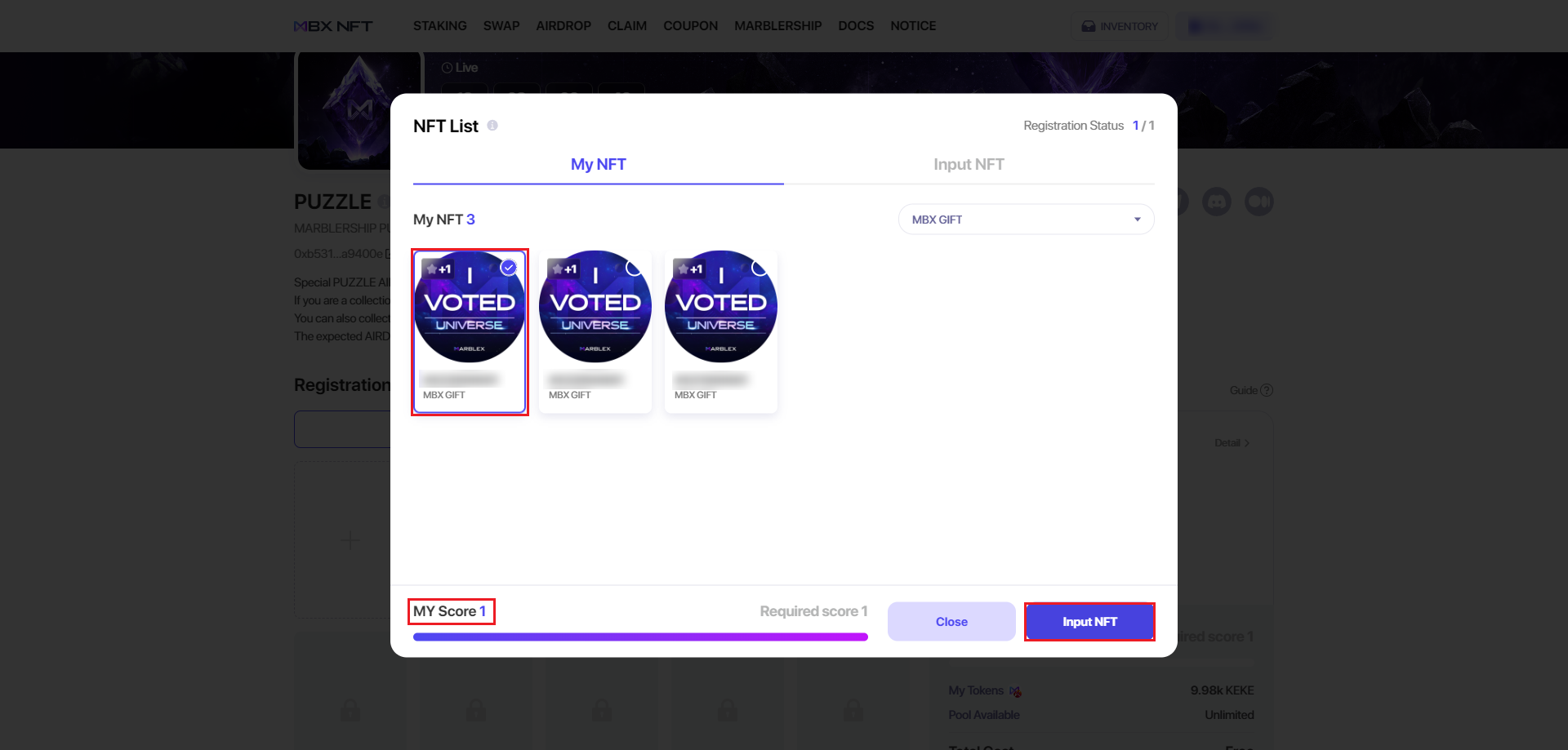 5. Select an NFT and you’ll notice that MY Score now displays 1. Click Input NFT.