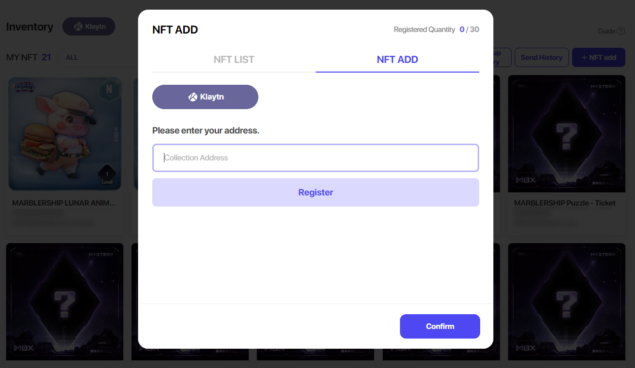 5\. The following pop-up will appear. Select the NFT ADD tab and enter the collection address in order to add NFT.