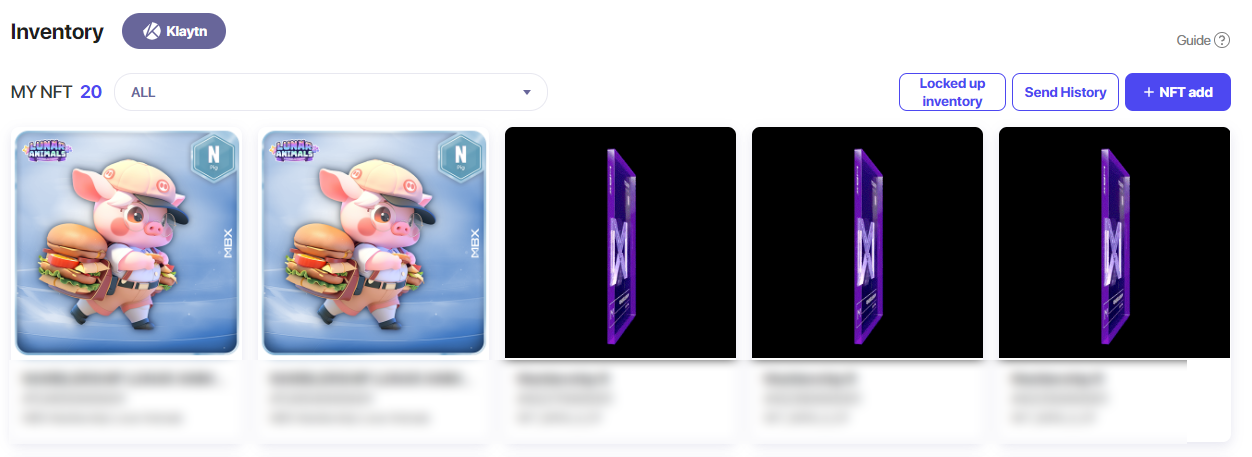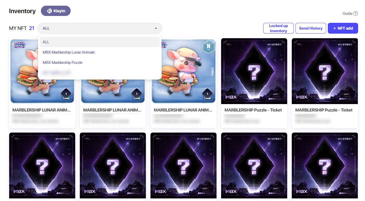 3\. From the drop down menu, you can filter your NFTs by their type. If any of your NFTs are locked up from AIRDROP, you may check them at Locked up inventory. At Send History, you can view your previous NFT transactions.