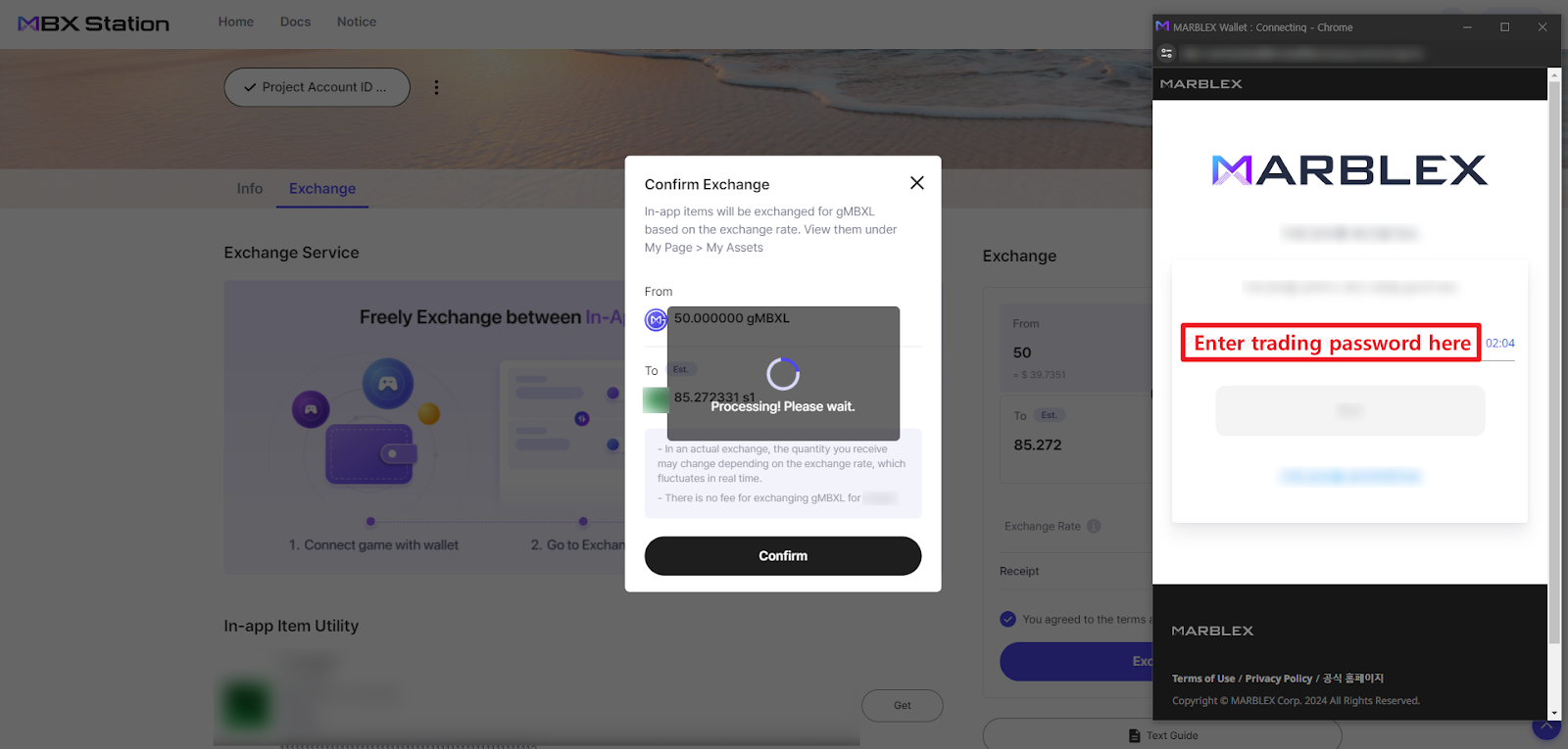 2. After agreeing with the terms and conditions, click Exchange. In the next pop-up window, enter your MARBLEX trading password.