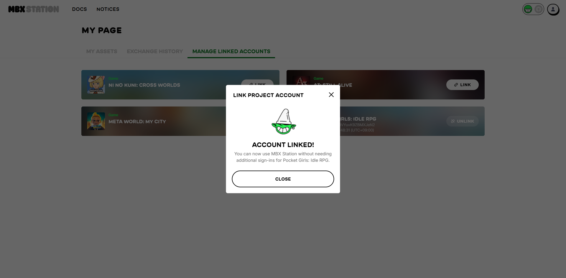 Congratulations! You have successfully linked your account with the game.