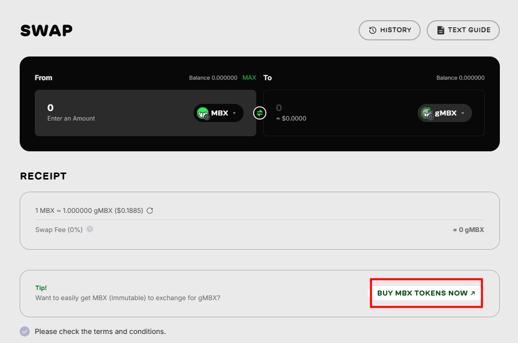 4. Enter the amount you want to exchange, and the output value (gMBX) will be automatically calculated based on the current exchange rate.