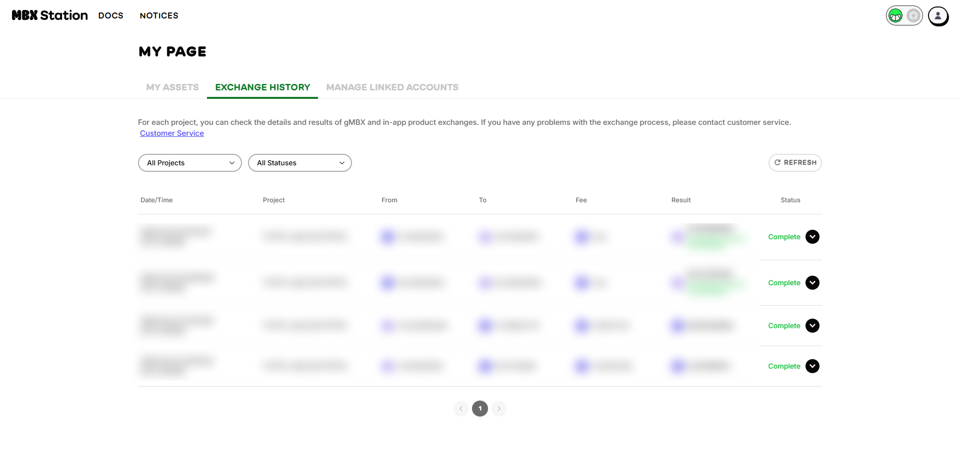 * Status: indicates whether the exchange is “In progress” or “Complete”. If the exchange fails, it will be labeled as “Fail”. If a refund for the exchange fee has been processed, it will display as "Fail (Refund Complete)." Alternatively, if the refund process is still ongoing, it will show as "Fail (Refund in progress)."
